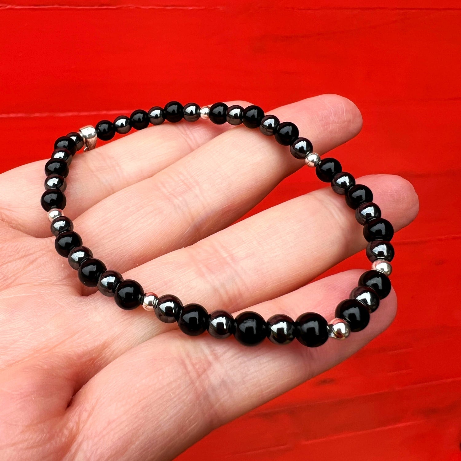 Pulsera Elasticada"Protección Terrenal" | Turmalina Negra, Ojo de Tigre y Hematita | Plata 925 a