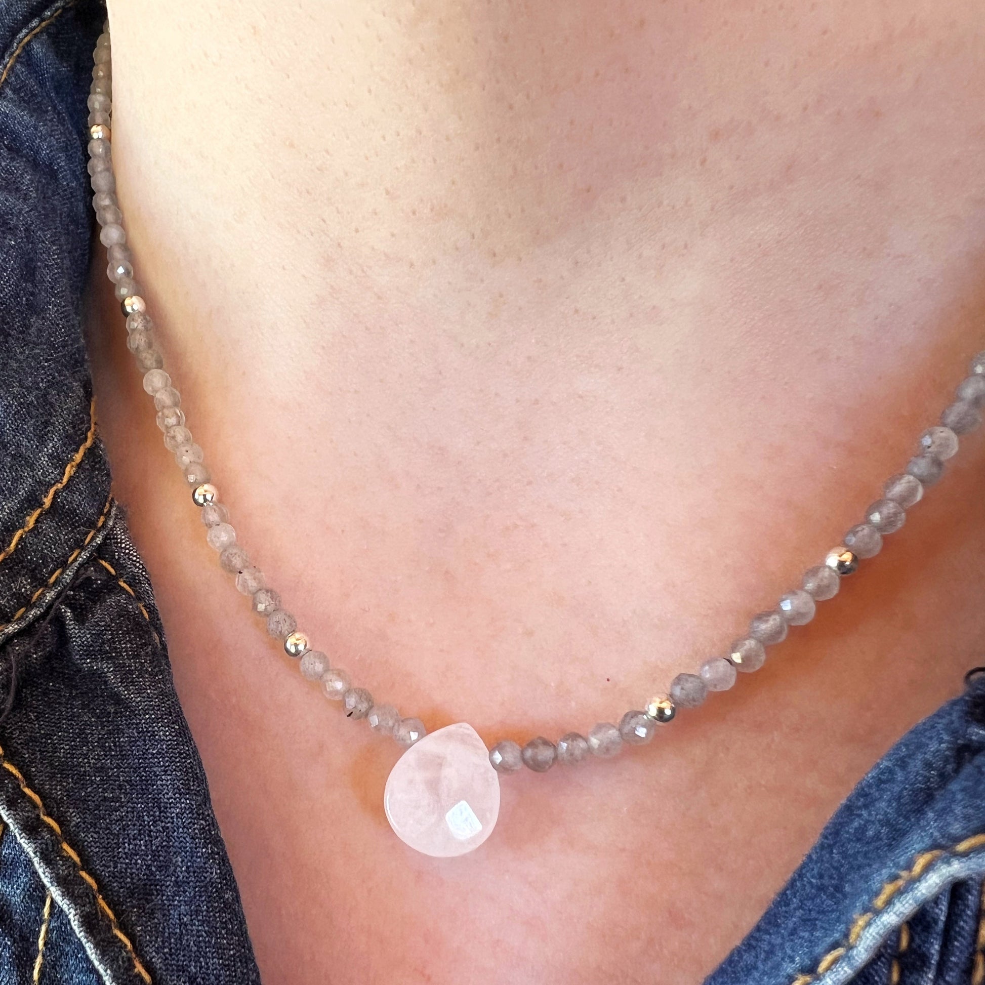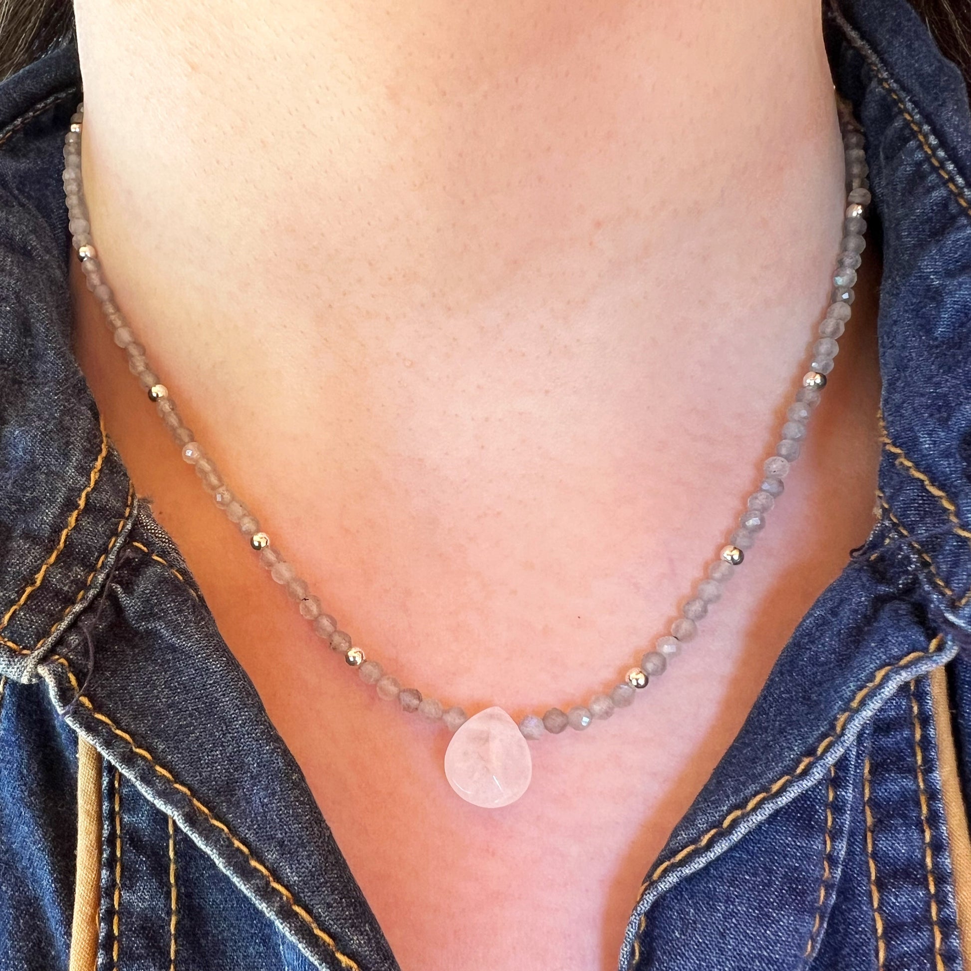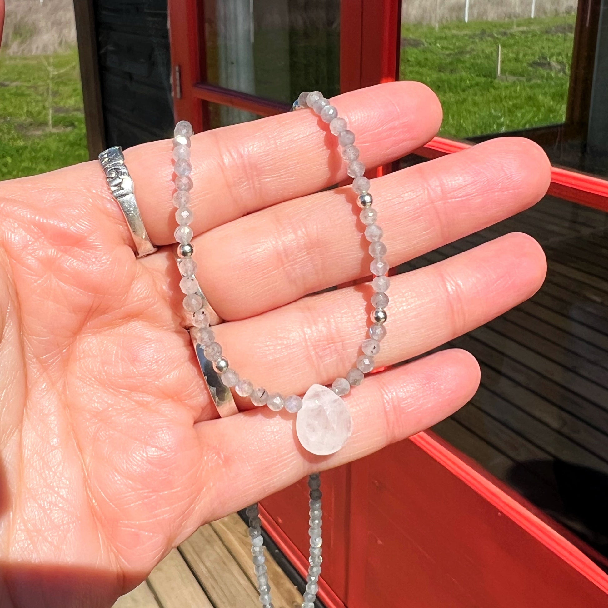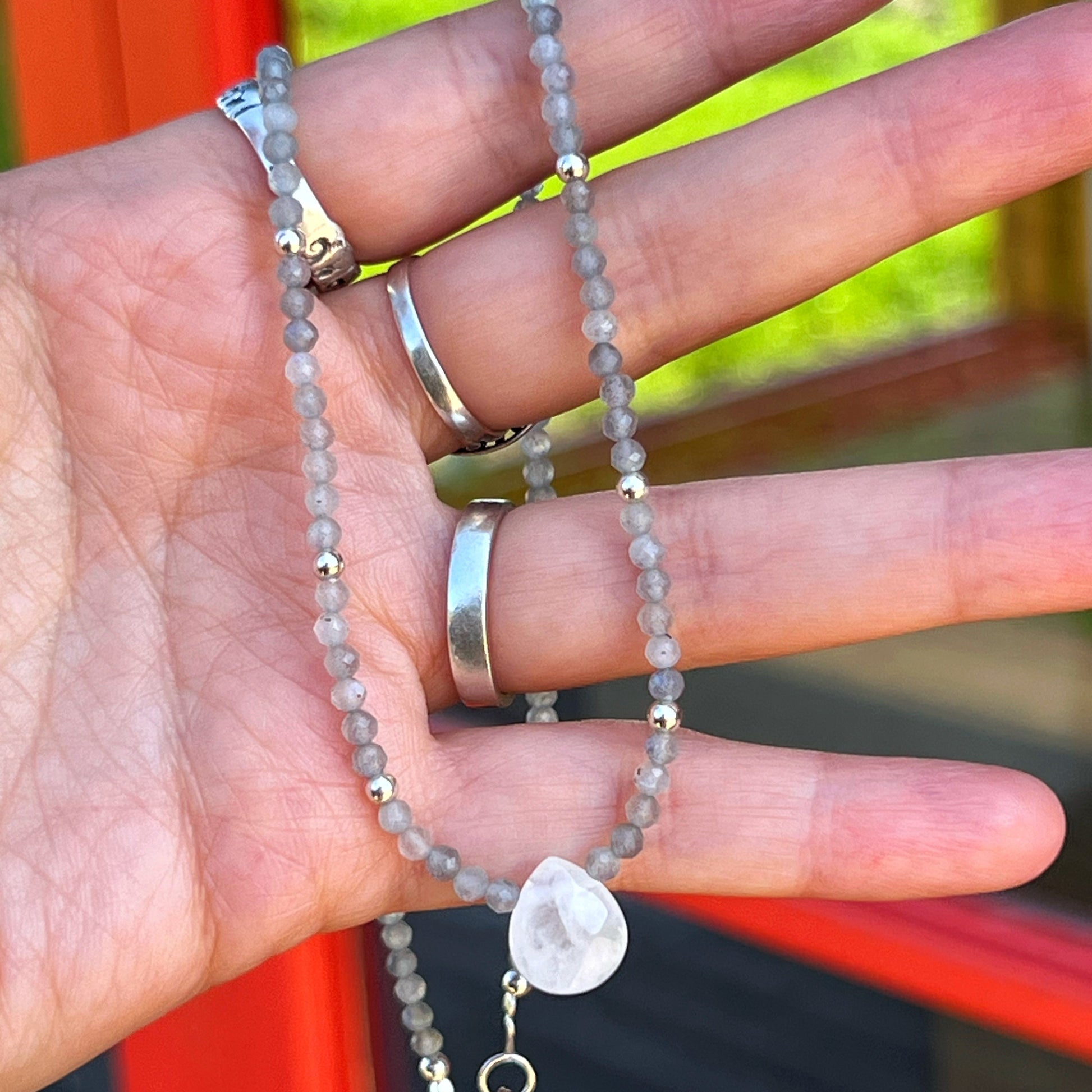 💎 En este collar, el cuarzo cristal en el centro potencia la energía de la labradorita, amplificando sus propiedades protectoras y de claridad, y facilitando que la energía fluya de manera armoniosa por todo el cuerpo.