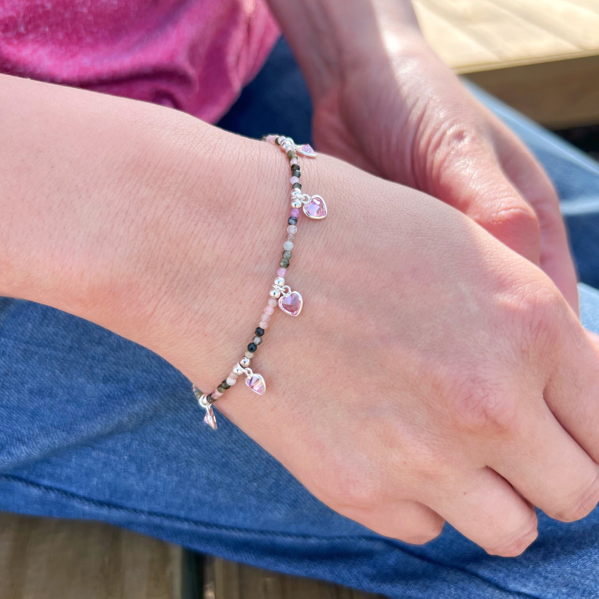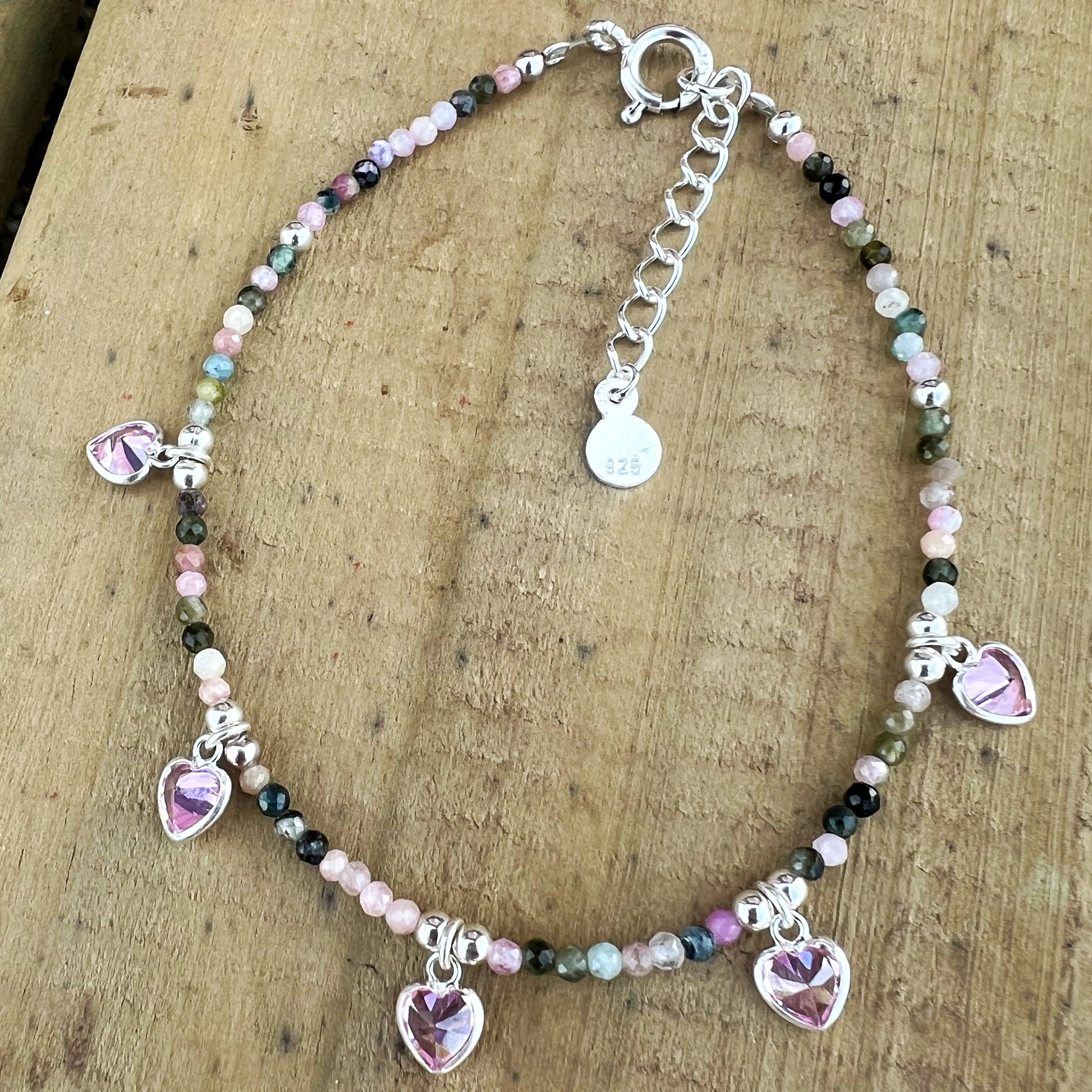 - Material: Plata 925, Piedras naturales, cristales rosados corazones