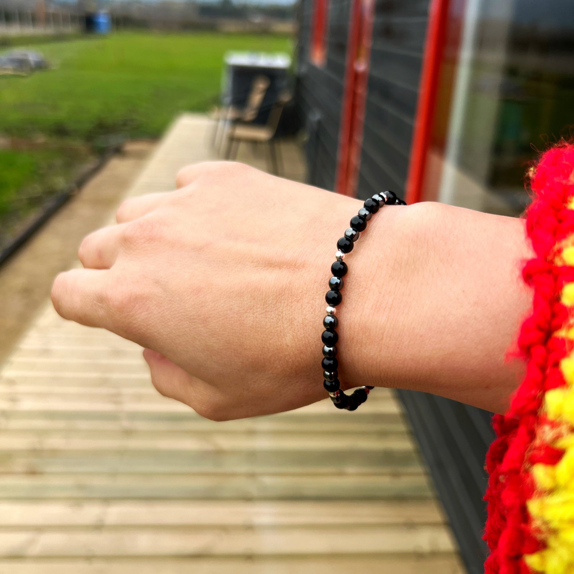 Pulsera elasticada"Protección Energética" | Turmalina negra y Hematita | Pelotitas Plata 925
